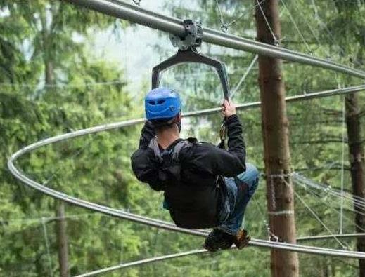 叢林穿梭是一項具有綜合驚險性和娛樂性為一體的現代化游樂項目。其原理采用自重動力牽引方案,以相應的傾角布置的鋼型材為軌道,以游客自身重量為動力,借助軌道裝置的高度差,在滑索上滑動的游樂設施。整個設施無其它動力,低碳、驚險。