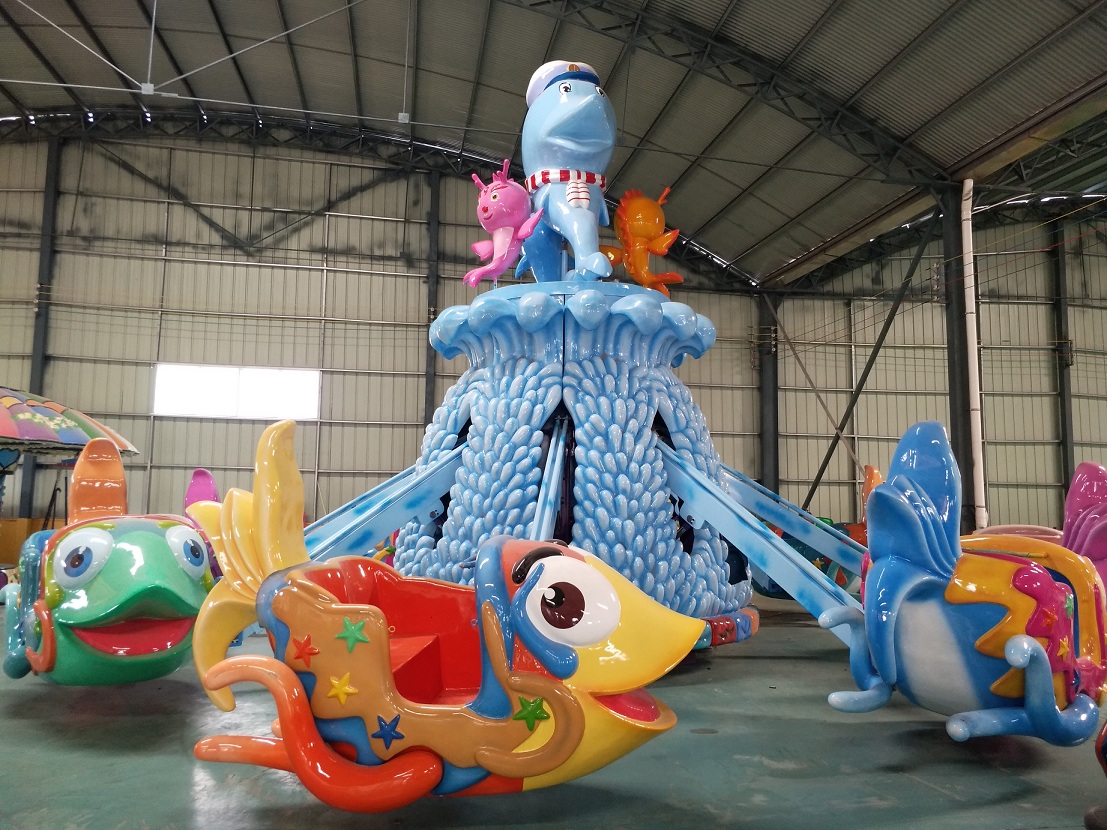 海洋總動員游樂場設(shè)備是許昌龍之盈游樂設(shè)備有限公司*新研發(fā)的一款水上旋轉(zhuǎn)類游樂設(shè)備。整套設(shè)備的色彩搭配和諧完美,清新亮麗;中間珊瑚島造型的底座托起幾只形態(tài)可愛的小丑魚,飛魚造型的座艙,卡通可愛,非常吸引游客尤其是小朋友的眼光。帶動座艙的大臂使用色彩鮮艷的玻璃鋼裝飾,工藝精良,外觀靚麗。產(chǎn)品集升降,旋轉(zhuǎn)于一體,增添了更多娛樂趣味。