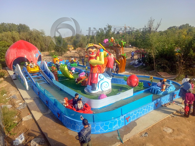 花果山漂流是龍之盈游樂設備的主打產品,花果山漂流,有著悟空巨型造型和各類造型逼真的大桃和各種互動的卡通造型,是公園當之無愧的主打兒童游樂備。花果山漂流游樂設備為了照顧不同客戶群體的需求特開發了滑坡和平行的兩種不同的型號,中間的水簾洞和小拱橋組成的滑坡增加了花果山漂流設備的趣味性。炫彩的顏色搭配,國標的鋼材配置,九層厚的玻璃鋼鑄就了許昌龍之盈游樂設備有限公司的“金剛”品質,花果山漂流具有極其吸引眼球的西游記造型和小朋友所喜愛的各種動物、植物。現在的花果山漂流從最早的圓形艙已經改為方形艙,互動性更強。 :我們可以按照不同用戶的需求、具體配置并且依據場地的大小、形狀進行布局設置。