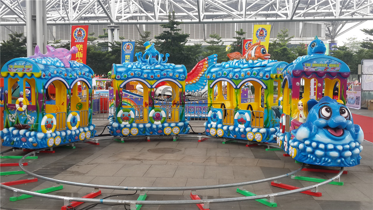 2、小火車(chē)是備受2-5歲小朋友喜愛(ài)的一款兒童游樂(lè)設(shè)施,海洋小火車(chē)擁有藍(lán)白相間的主色,就像藍(lán)天白云給人軟綿綿的感覺(jué)。滑行過(guò)程中車(chē)輪與軌道的摩擦,會(huì)使坐在車(chē)廂里的小朋友上下顛簸,更像是在大海中翻滾前行。車(chē)廂數(shù)量一般為4節(jié),可供14人乘坐,車(chē)體采用優(yōu)質(zhì)玻璃鋼,耐磨韌性好,龍之盈游樂(lè)始終不忘初心,用質(zhì)量說(shuō)話,用產(chǎn)品樹(shù)立品牌。
